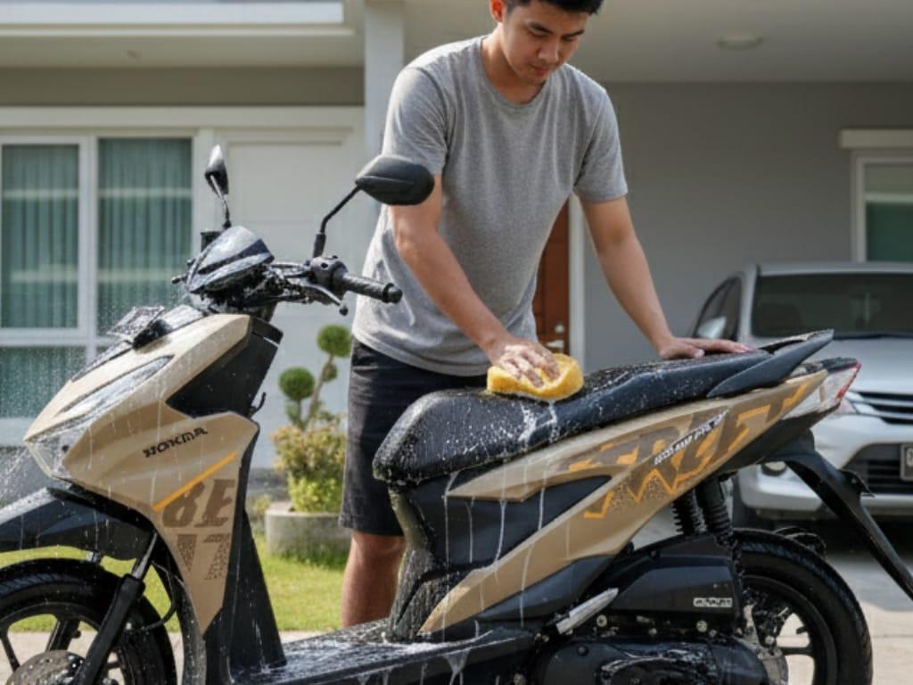 Mencuci dan membersihkan sepeda motor memang menjadi rutinitas, untuk melengkapinya pengguna sepeda motor biasanya menambahkan cairan untuk mengkilapkan bagian sepeda motor. Untuk bagian part bodi yang terbuat dari plastik atau logam tentunya akan meningkatkan tampilan sepeda motor menjadi tampak mengkilap seperti baru, tapi cairan tersebut sebaiknya jangan diberikan pada bagian jok sepeda motor.